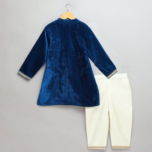 Blue Velvet bandhgala embroidery set with Offwhite trousers