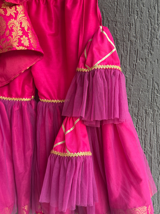 One off shoulder blouse with attached dupatta and chanderi Lehnga