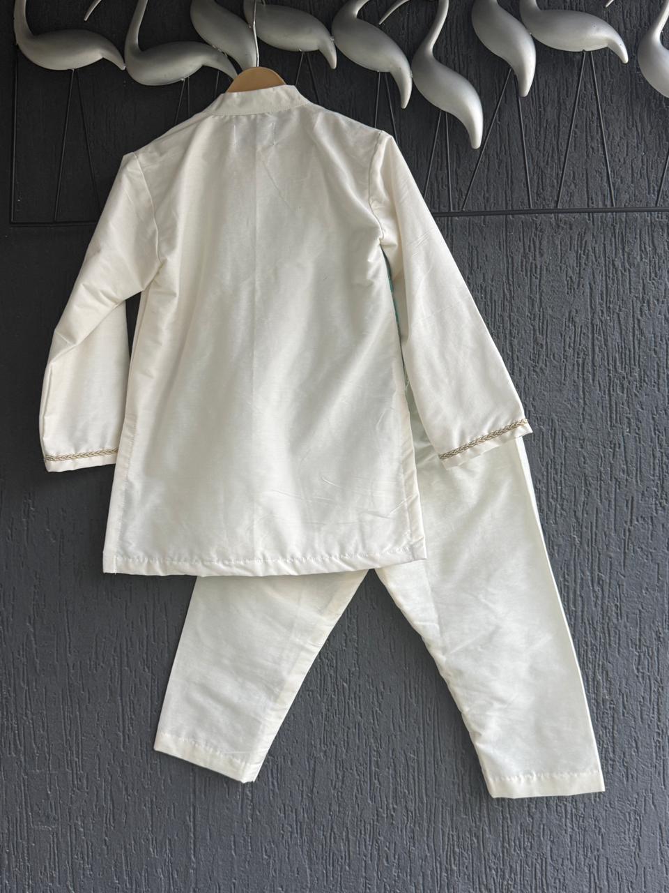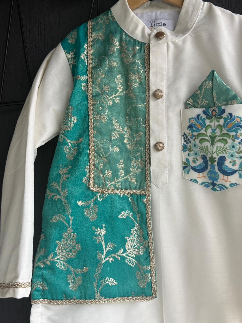 Off white kurta set with two shades of green chanderi panels over on one side of the kurta . Kurta with printed pocket and front opening . Bottom comes with elasticated waist. LTG194 |