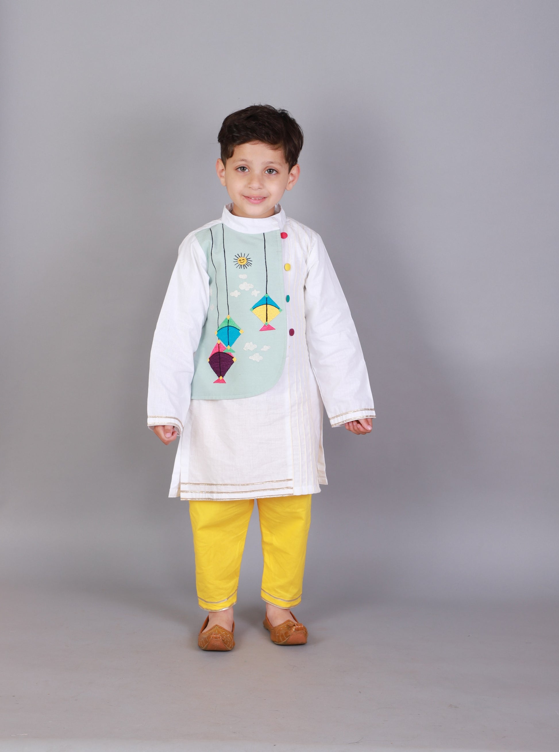 White cotton Poplin Kurta pyjama set with kite embroidered palla over one side of the kurta . Pyjama with Elasticated waist.
